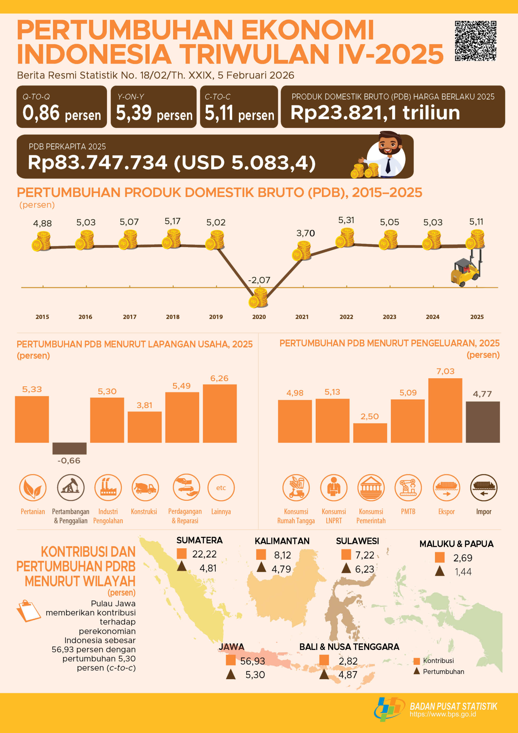 Ekonomi Indonesia triwulan IV-2025 terhadap triwulan IV-2024 mengalami pertumbuhan sebesar 5,39 persen (y-on-y). Dari sisi produksi, Lapangan Usaha Transportasi dan Pergudangan mengalami pertumbuhan tertinggi sebesar 8,98 persen. Sementara dari sisi pengeluaran, Komponen Pembentukan Modal Tetap Bruto (PMTB) mengalami pertumbuhan tertinggi sebesar 6,12 persen.